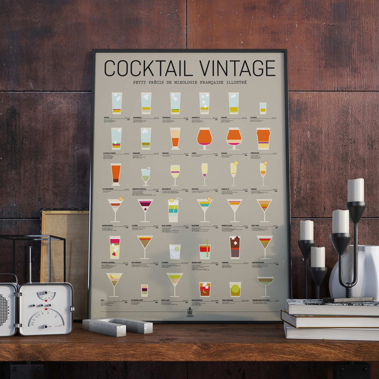 Du Panaché au Trou Normand, cette affiche au graphisme savoureux recense 36 cocktails Français... des plus désuets aux plus célèbres. Elle n'est pas dangereuse pour la santé et peut-être consommée sans modération !
