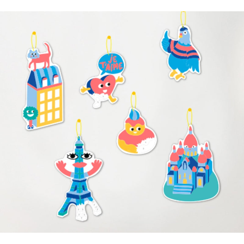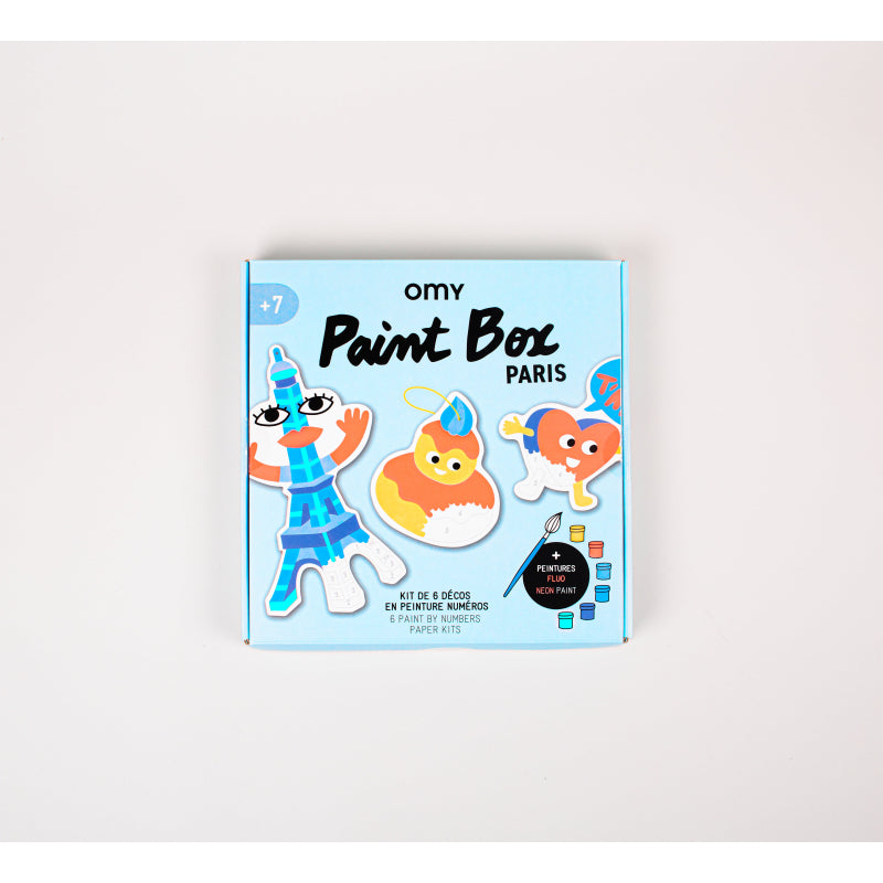 Kit de peinture par contenant 2 feuilles cartonnées avec 3 décorations, 1 pinceau, 6 petits pots de peinture acrylique et 1 cordon à découper