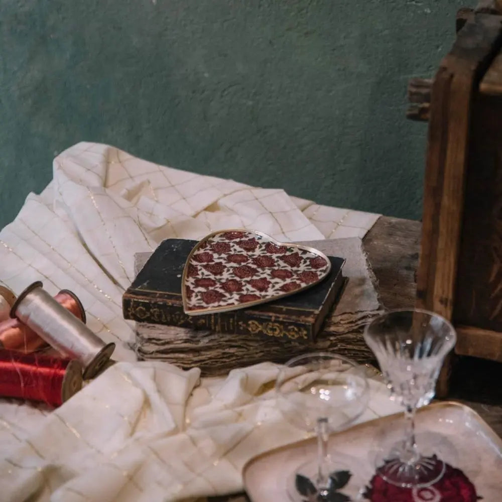 Avec sa forme de coeur et ses élégantes roses rouges sur fond beige, le plateau Rose  apporte une nuance de douceur et de poésie dans nos intérieurs.