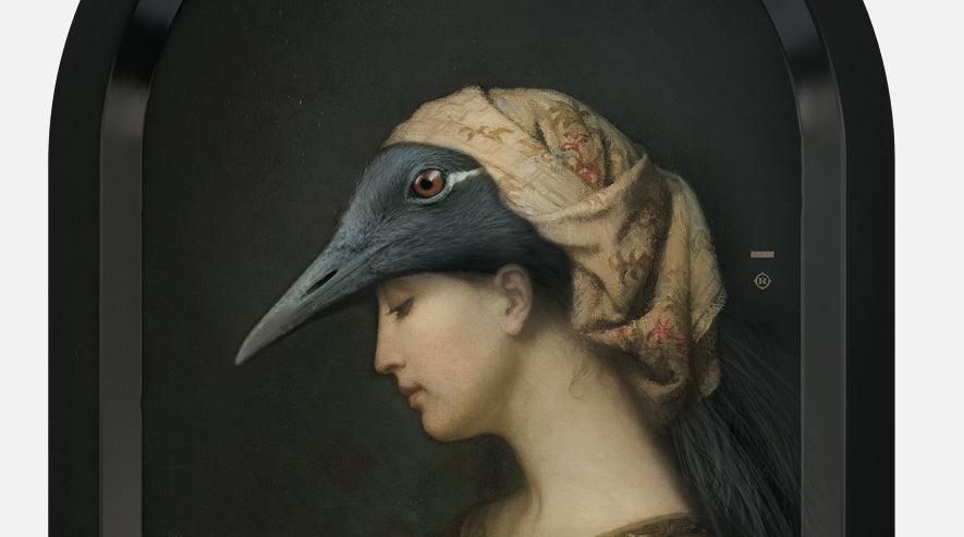 Calme et sérénité semblent émaner d’Alma, pourtant coiffée d’une grue bleue au regard rivé sur de lointains horizons, quelques aspirations nomades ou évasions inavouables à son apparente bienséance…