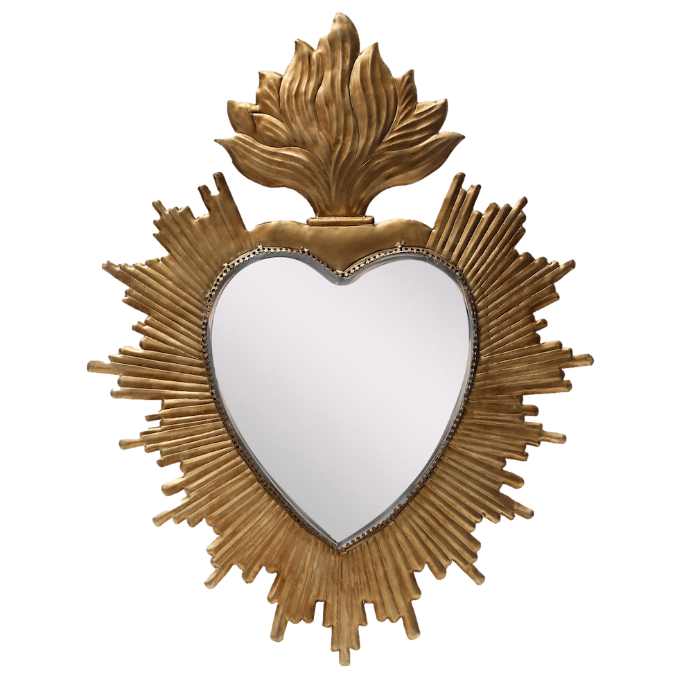 Orné de rayons, ce grand miroir radieux en fer blanc est embossé et patiné à la main.
