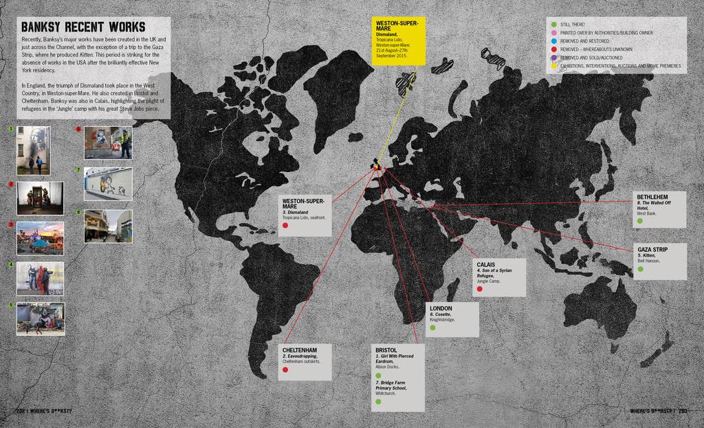 De ses pochoirs de rue à Londres à ses performances dans de grandes institutions en passant par ses peintures sur le mur de gaza , le travail de Banksy est pluridisciplinaire et universel.