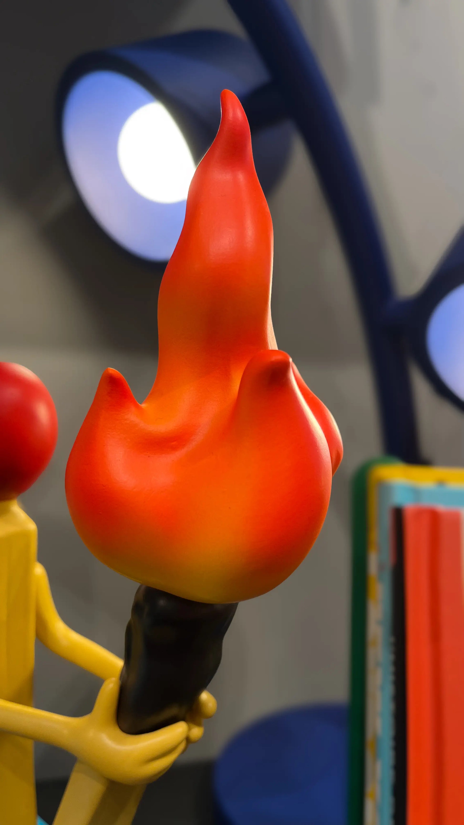 En résine colorée, la figurine représente une allumette anthropomorphe aux traits volontairement naïfs. Sa flamme, intensément colorée, devient le point de bascule du récit : une énergie vive, une passion qui embrase, se consume, et laisse une trace.