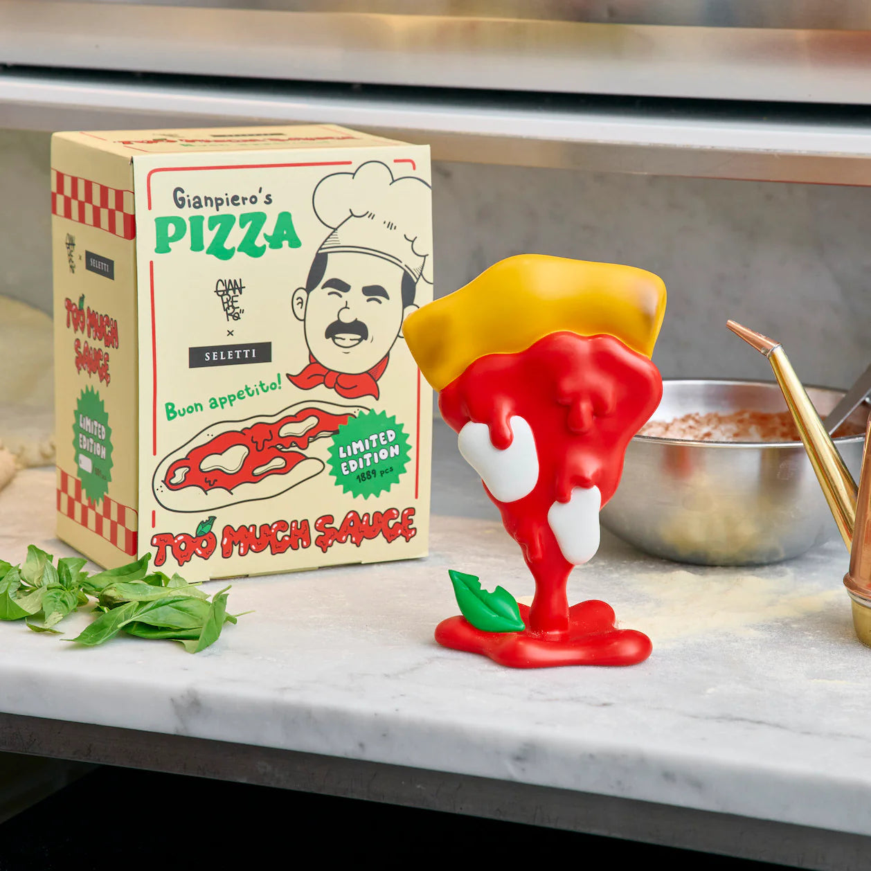 La part de pizza "Too Much sauce" de Gianpiero est ici transposée en 3 dimensions grâce à la collaboration du designer avec Seletti.