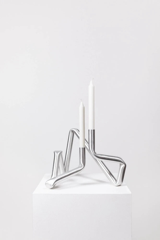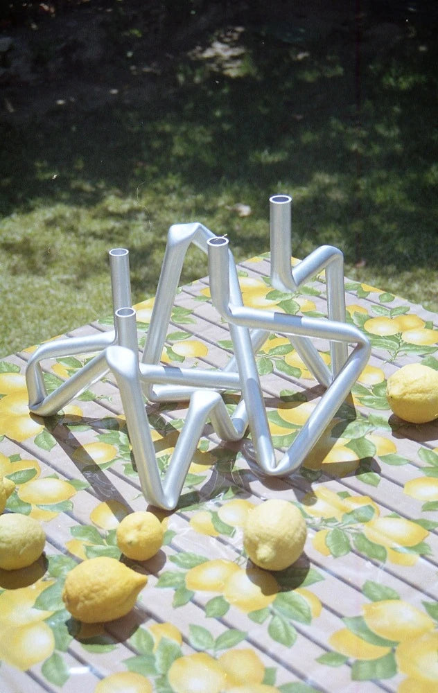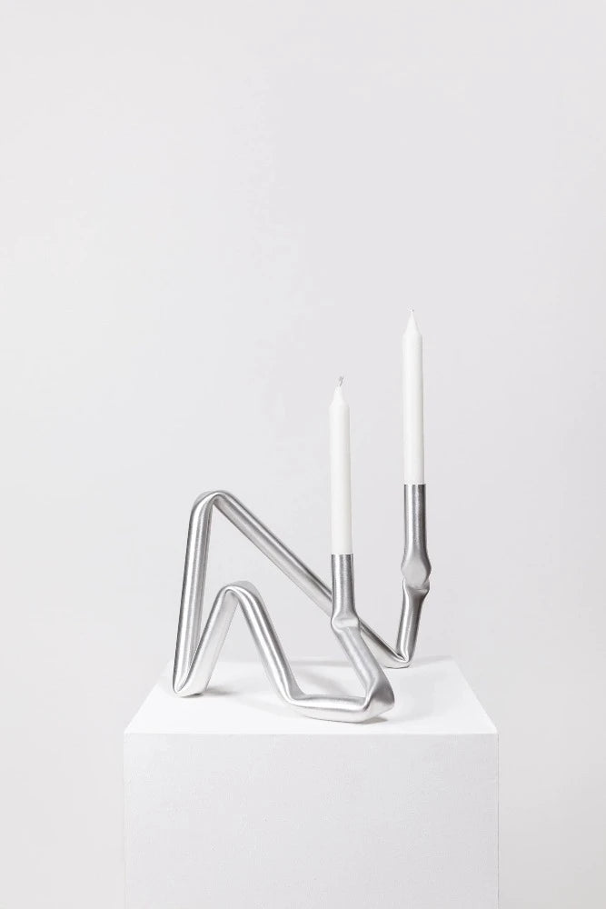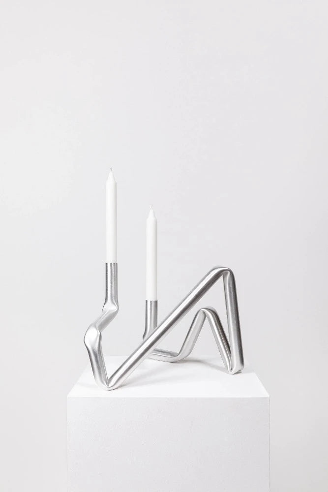 Les deux esprits curieux aiment rompre avec les conventions et remettre en question les procédés de fabrication traditionnels : par leur manipulation de la matière, ils repoussent les limites de la forme pour lui conférer une profondeur singulière. Leur exploration de la flexibilité de l'aluminium a donné naissance à une première collection d'objets utilitaires, Primi, composée de vases, chandeliers et cintres.
