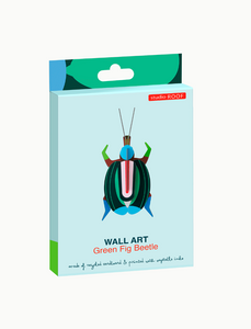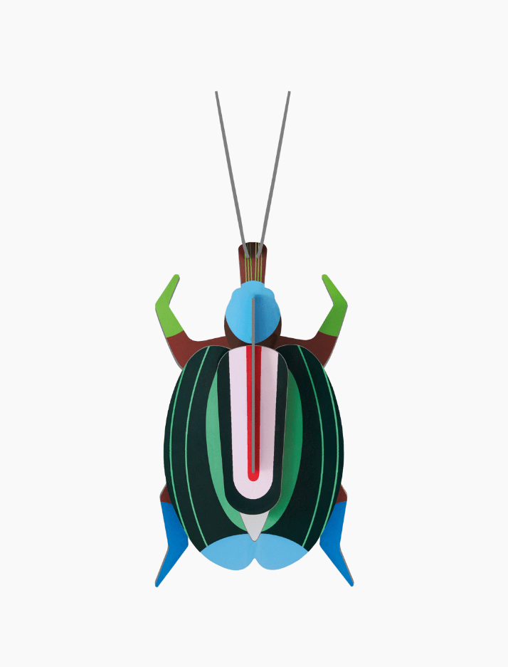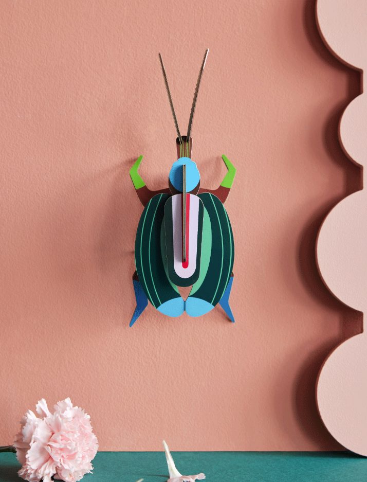 Ces insectes en carton recyclé, à monter soi-même, décorent nos murs de leurs motifs pop et leurs couleurs contrastées ; comme ce Green Fig beetle, ou Scarabée des figues (*Cotinis mutabilis)