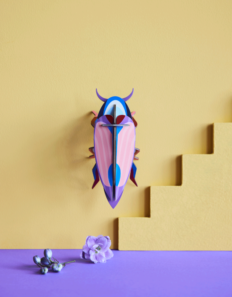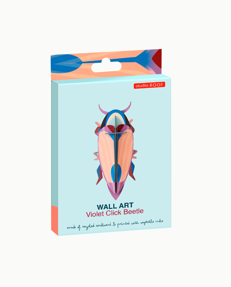 Ces insectes en carton recyclé, à monter soi-même, décorent nos murs de leurs motifs pop et leurs couleurs contrastées ; comme ce Violet Click beetle, ou Taupin violacé (*Limoniscus violaceus)