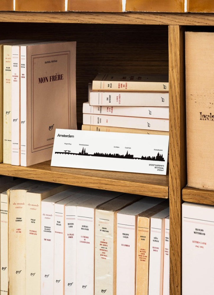 Affichez la mini skyline Amsterdam et ses monuments emblématiques : pont Magere Brug, l'emblématique Quartier Rouge, l'Eglise Saint-Nicolas et la tour Montelbaanstoren.