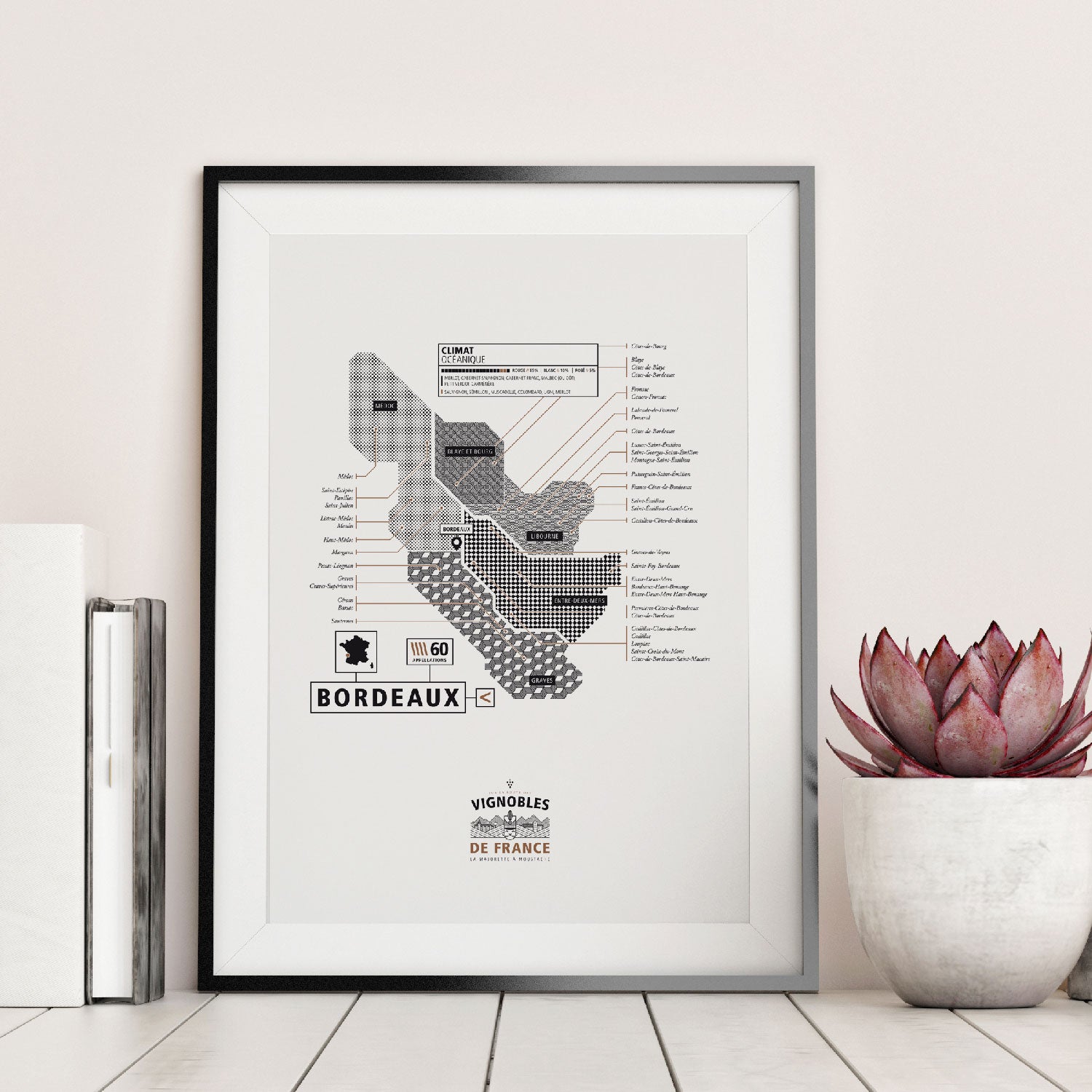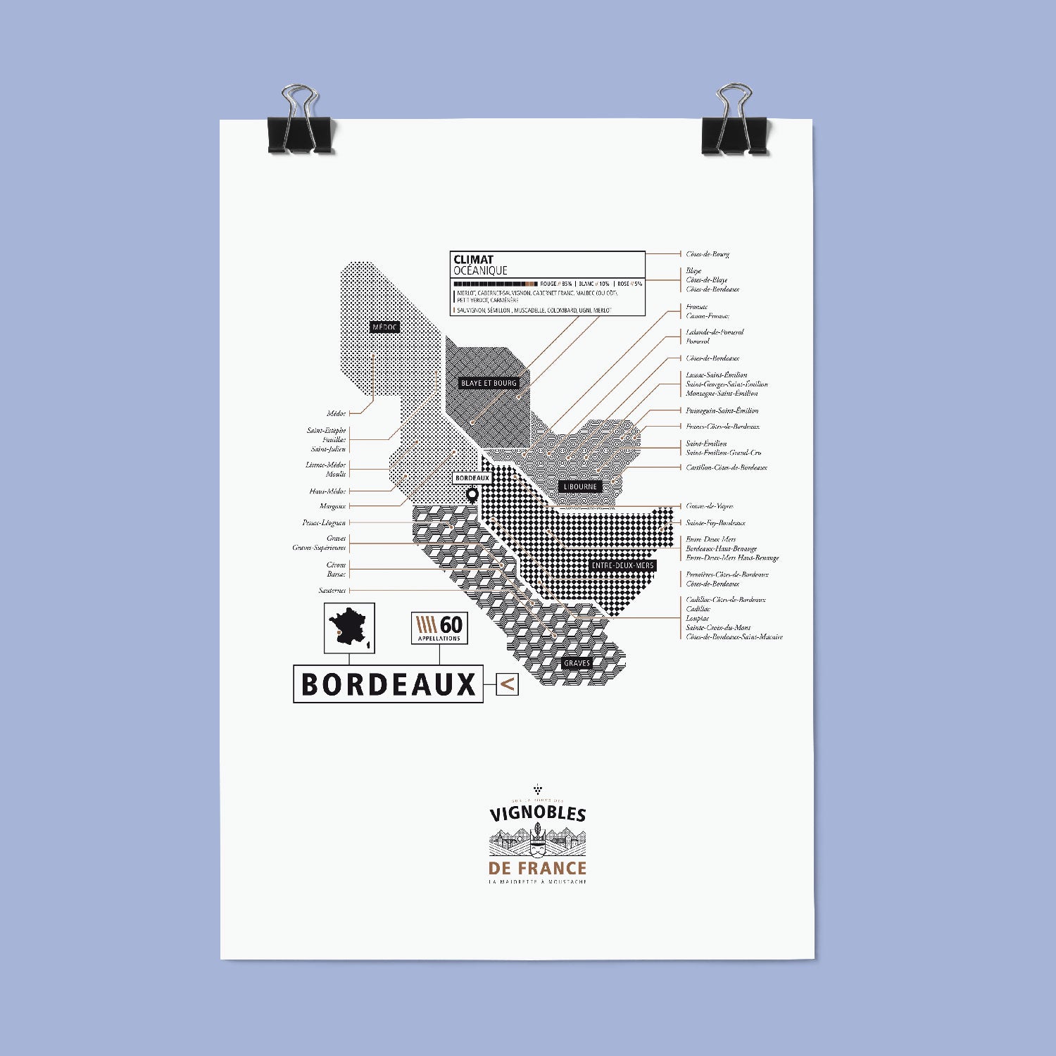 À la manière d'une route des vins, cette affiche minimaliste recense les différents trésors oenologiques de Bordeaux.